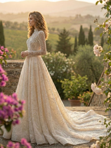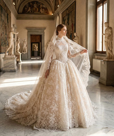Her gelinlik, elde şekillenen detaylar, özel kalıp çalışması ve haute couture teknikleriyle üretilir.